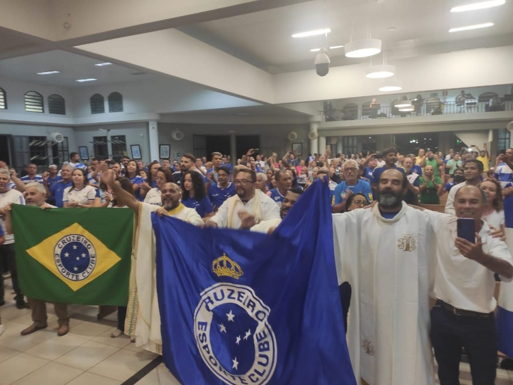 A celebração pelo aniversário esteve a cargo dos padres Brigido, João Carlos, Henderson e Fernandes, além do diácono Francisco, cruzeirenses assumidos. A missa foi realizada segunda-feira (02) na Igreja São Judas Tadeu, localizada no Bairro homônimo, e presidida pelo padre Inivaldo Fernandes de Lima, o Pe. Fernandes, da Paróquia Santo Antônio, em Grão Mogol. Concelebraram os padres Antônio Brígido de Lima, o Pe. Brígido, da paróquia São Judas Tadeu, em Montes Claros; Henderson Pereira do Carmo, o Pe. Henderson, da paróquia São Geraldo, em Japonvar; João Carlos Viana Torres, o Pe. João Carlos, da paróquia Senhora Sant’Ana, em Ponto Chique; e pelo diácono Francisco David Silva, da paróquia Nossa Senhora da Conceição, em Francisco Dumont. Os torcedores do Cruzeiro compareceram em grande número e fizeram questão de ir com a camisa do time celeste. Cada um levou um quilo de alimento não perecível, que será distribuído pela paróquia para as famílias em vulnerabilidade social. Durante a homilia, o padre Fernandes fez questão de saudar os cruzeirenses, lembrando as conquistas do clube ao longo de 102 anos e destacando o retorno do Cruzeiro à Série A do Campeonato Brasileiro. “Parabéns à nação azul por este dia especial, que marca o aniversário de um time que nos deu muitas alegrias, com duas Copas Libertadores, duas Supercopas da Libertadores, uma Recopa, quatro Campeonatos Brasileiros, seis Copas do Brasil e um Campeonato Brasileiro da Série B, além dos 38 Campeonatos Mineiros. “Tivemos um momento ruim, que foi a queda para a segunda divisão do campeonato brasileiro, mas de agora em diante o Cruzeiro não cairá mais”, profetizou. O saudoso cruzeirense arcebispo de Montes Claros, Dom Geraldo Majela de Castro, também foi homenageado A missa seguiu a liturgia da Igreja. Somente após a bênção final foi permitido que os torcedores cantassem o hino do clube e outros cânticos da torcida celeste. Foi o quinto ano consecutivo que a paróquia São Judas Tadeu celebra missas em Ação de Graças pelo aniversário do clube mais vencedor de Minas Gerais.