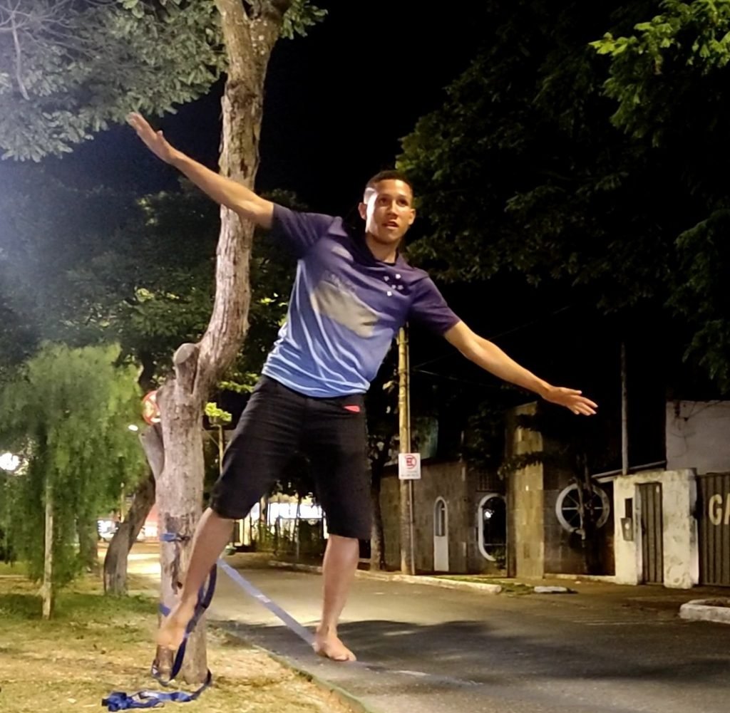 Slackline é um esporte radical relativamente recente. A base do esporte está em se equilibrar em uma fita de nylon estreita e muito flexível, que deve ter suas extremidades fixadas em árvores, postes e rochas. É uma ótima atividade para treinar equilíbrio, postura e concentração. MOC É O LUGAR… do slackline Texto: Attilio Faggi – Fotos: Divulgação Alguns esportes, como a corrida de rua, por exemplo, podem parecer pouco dispendiosos, em uma análise inicial. Mas, quando você para para analisar, já gastou com tênis específicos para corrida, camisetas e shorts de tecidos tecnológicos, boné, óculos de sol, relógio GPS… Já com o slackline, é diferente. A modalidade consiste em atravessar uma linha de um ponto ao outro, ou manter-se estático por um período determinado de tempo sobre uma fita flexível que pode estar amarrada, por exemplo, entre duas árvores. Davi Mendes é autônomo e pretende ingressar no serviço público através de concurso. O jovem de 20 anos é morador do bairro São José e treina, utilizando uma fita azul, na Praça Flamarion Wanderley, bem em frente à antiga sede do Jornal de Notícias, um tradicional periódico montes-clarense. Ele conta que descobriu o slackline através de um amigo e se interessou pelas características do esporte, que exige muito equilíbrio e concentração para a execução das manobras, além de resistência e consciência corporal. O jovem procura treinar duas vezes por semana, e cada treino dura entre 1h30 e duas horas. Amigo de Davi, Iago Marcos talvez já tenha prestado um serviço a você, leitor, pois é entregador e, nesses tempos de pandemia, as pessoas permaneceram por mais tempo em suas residências, optando muitas vezes pelo delivery. O jovem de 22 anos passa 8 horas por dia em cima de sua motocicleta, mas alega que não sente dores após um dia de trabalho. Assim como Davi, ele treina há cerca de 2 anos, entre idas e vindas; Iago explica que a atividade exige muito esforço físico mas que, com o tempo, o aprimoramento da capacidade de executar as manobras vai tornando o esporte mais prazeroso. Além do slackline, Iago também gosta de pegar a bicicleta e pedalar até uma cachoeira com os amigos. As cachoeiras Três Irmãs e do Alfeirão são alguns locais que já visitou. Já o técnico em refrigeração João Emanuel Maciel, 19, mora no bairro Monte Carmelo e acaba de começar a praticar o slackline. Influenciado pelos amigos que o convidaram “a dar um rolê de slackline”, João já mostra que tem jeito para a coisa. Davi conta que existem campeonatos da modalidade em outras cidades, mas que, em Montes Claros, ainda não aconteceu nenhum, pelo menos que ele saiba. O autônomo explica que a execução das manobras recebe uma pontuação nas competições, mas que não sabe o nome das sequências de movimentos. Davi ainda acrescenta que o importante para ele é praticar uma atividade física e compartilhar momentos de lazer com os amigos.