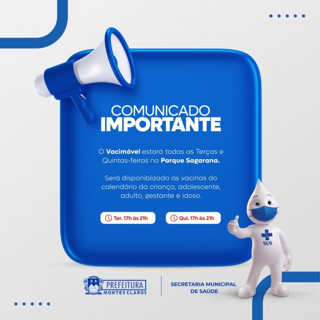A Prefeitura de Montes Claros criou mais um ponto de vacinação para facilitar a vida do cidadão que precisa atualizar o seu Cartão de Vacinas. Assim, já está disponível no Espaço Sagarana (bairro Ibituruna), todas as terças e quintas-feiras, das 17 às 21 horas, o Vacimóvel da Prefeitura, oferecendo todas as vacinas do Calendário Nacional de Vacinação para crianças, adolescentes, adultos, gestantes e idosos. É preciso comparecer levando documento pessoal, Cartão SUS e Cartão de Vacinas (se tiver). Para mais informações: 2211- 4353.