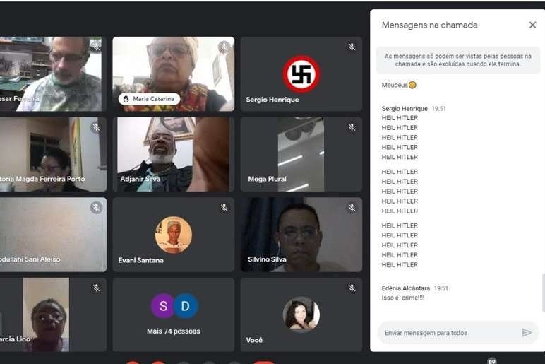 MENSAGENS DE ÓDIO – Grupo exibiu cenas pornográficas, bandeiras nazistas, gritos de Heil Hitler e músicas de baixo calão, interrompendo o encontro Jornal O Tempo Cerca de 100 pessoas que acompanhavam, na noite de quinta-feira (10), a 1ª Conferência Municipal de Igualdade Racial de Divinópolis, no Centro-Oeste mineiro, foram surpreendidas por mensagens de cunho nazista que levaram à interrupção do encontro, que acontecia virtualmente. A informação foi divulgada pela Prefeitura de Divinópolis, que explicou que os ataques aconteceram após cerca de 50 minutos de reunião, durante a leitura do regimento. Foram postadas na plataforma postagens de cenas pornográficas, bandeiras nazistas e gritos de Heil Hitler, seguidos de músicas de “baixo calão”. “Isso fez com que uma das organizadoras, Marcelina Liberaro, fosse obrigada a interromper a conferência, que somente pode ser retomada posteriormente”, conta o gerente da Casa dos Conselhos, Paulo Marius. O presidente do Conselho de Igualdade Racial do município, Célio Lopes, disse estar extremamente chateado com a situação. “Me senti impotente vendo tudo aquilo, sem saber de onde vinha, sem poder fazer nada. Mas, ao mesmo tempo, isso me fortaleceu, pois vi que estou no caminho certo, que nossa luta pelo povo negro, por nossa religiosidade, está incomodando. Por isso vamos conseguir cada vez mais ocupar o lugar que merecemos na sociedade, não vamos desistir”, afirma. A Prefeitura de Divinópolis repudiou os ataques, chamados de “ato anti-democrático, racista e vergeonhoso”. “Esperamos que as forças de segurança possam descobrir os responsáveis”, completou o executivo municipal. Ocorrência na polícia Após os ataques, Célio Lopes conversou com a vice-prefeita, Janete Aparecida, que registrou um boletim de ocorrência na Polícia Militar (PM). “As investigações para poder chegarmos ao autor serão conduzidas pela Polícia Civil (PC), completou a Prefeitura. “Nosso povo negro é forte e está acostumado a enfrentar todo tipo de dificuldade. Esse ataque no primeiro dia da conferência é só um exemplo das muitas lutas que o povo negro tem que enfrentar para vencer o racismo e outros tipos de intolerância, mas desistir jamais”, disse a vice-prefeita. A subseção da Ordem dos Advogados do Brasil (OAB) em Divinópolis também repudiou o ataque nazista ocorrido na Conferência. “A invasão por neonazistas é um dos sintomas da progressiva deterioração do Estado Democrático de Direito e dos contínuos ataques aos direitos humanos no Brasil. O nazismo marcou negativamente a história da humanidade como um movimento racista, nacionalista, antissemita e eugenista que deflagrou a Segunda Guerra Mundial”, pontuou a nota, que ainda exige a investigação e punição dos responsáveis pelo crime.
