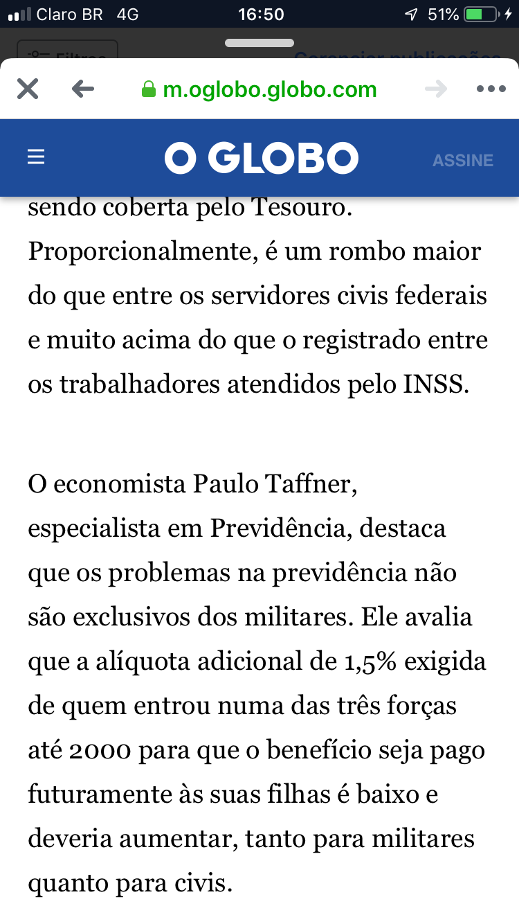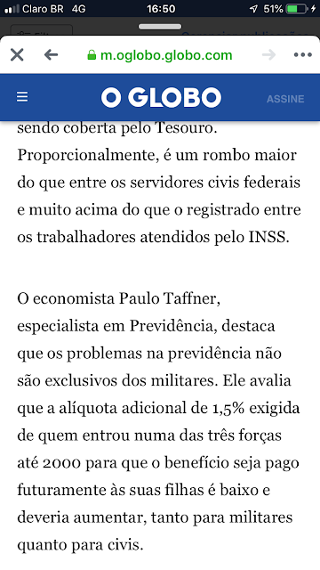O economista Paulo Taffner, especialista em Previdência, destaca que os problemas na previdência não são exclusivos dos militares. Ele avalia que a alíquota adicional de 1,5% exigida de quem entrou numa das três forças até 2000 para que o benefício seja pago futuramente às suas filhas é baixo e deveria aumentar, tanto para militares quanto para civis.