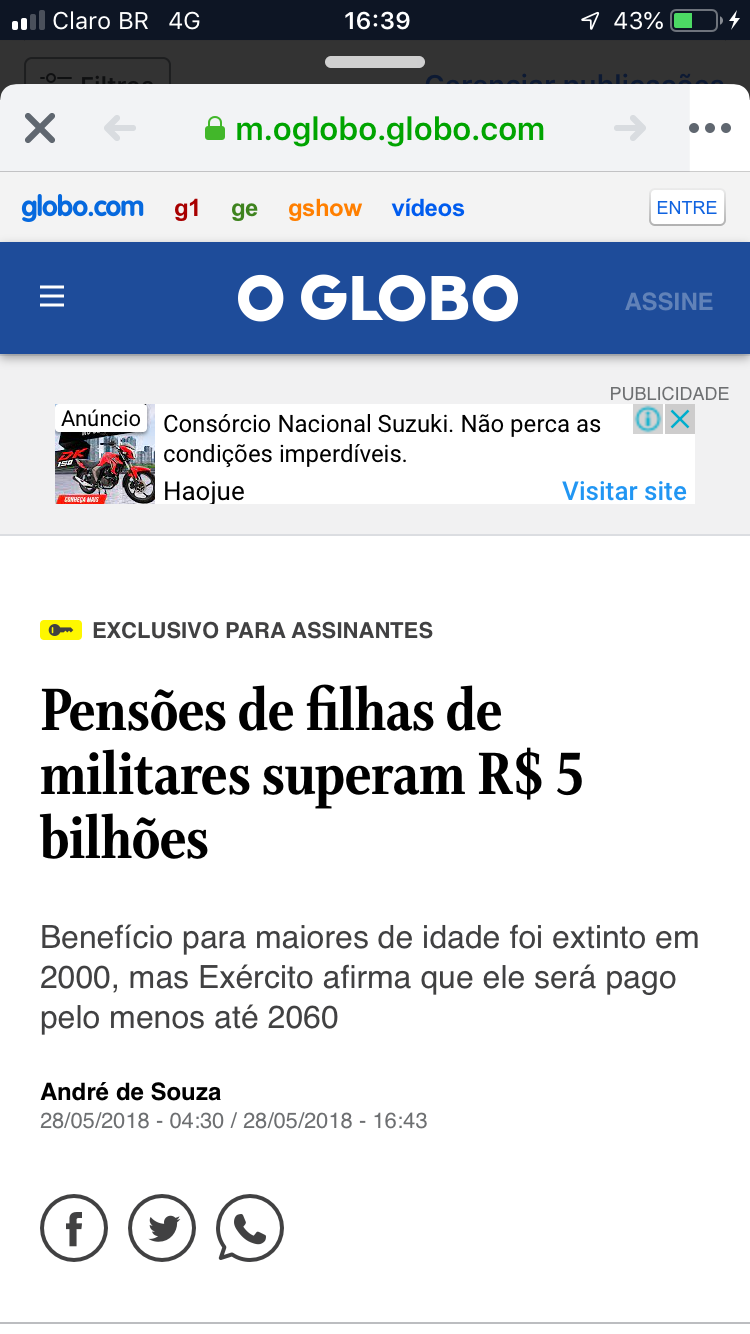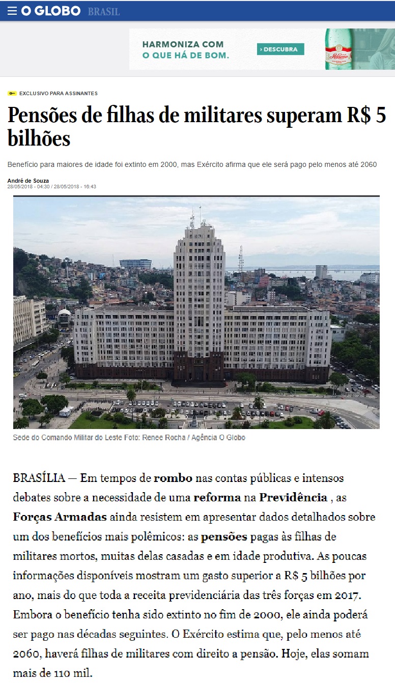 – Em tempos de rombo nas contas públicas e intensos debates sobre a necessidade de uma reforma na Previdência, as Forças Armadas ainda resistem em apresentar dados detalhados sobre um dos benefícios mais polêmicos: as pensões pagas às filhas de militares mortos, muitas delas casadas e em idade produtiva. As poucas informações disponíveis mostram um gasto superior a R$ 5 bilhões por ano, mais do que toda a receita previdenciária das três forças em 2017. Embora o benefício tenha sido extinto no fim de 2000, ele ainda poderá ser pago nas décadas seguintes. O Exército estima que, pelo menos até 2060, haverá filhas de militares com direito a pensão. Hoje, elas somam mais de 110 mil.