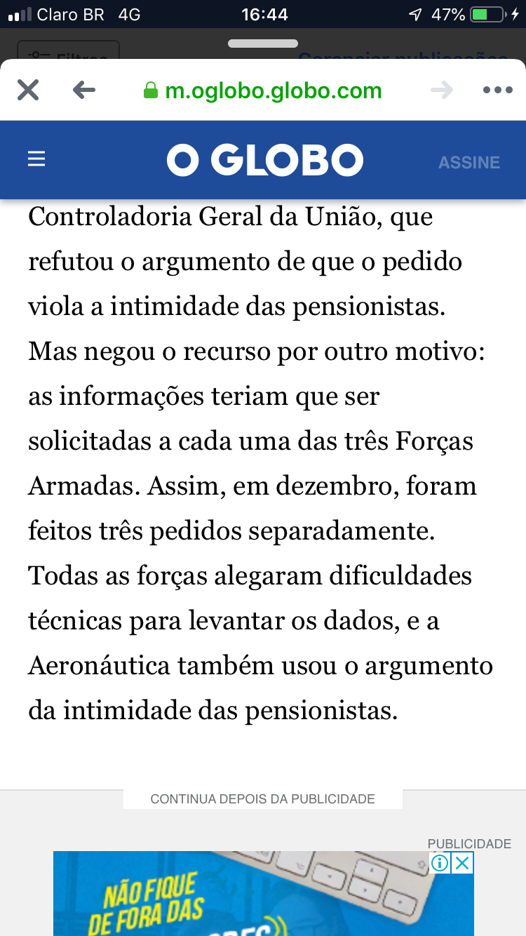 Dias depois, em resposta a novo recurso, o Ministério da Defesa informou que não é obrigado a atender pedidos “que exijam trabalhos adicionais de análise, interpretação ou consolidação de dados e informações, ou serviço de produção ou tratamento de dados que não seja de competência do órgão ou entidade”. O GLOBO recorreu de novo, desta vez à Controladoria Geral da União, que refutou o argumento de que o pedido viola a intimidade das pensionistas. Mas negou o recurso por outro motivo: as informações teriam que ser solicitadas a cada uma das três Forças Armadas. Assim, em dezembro, foram feitos três pedidos separadamente. Todas as forças alegaram dificuldades técnicas para levantar os dados, e a Aeronáutica também usou o argumento da intimidade das pensionistas.