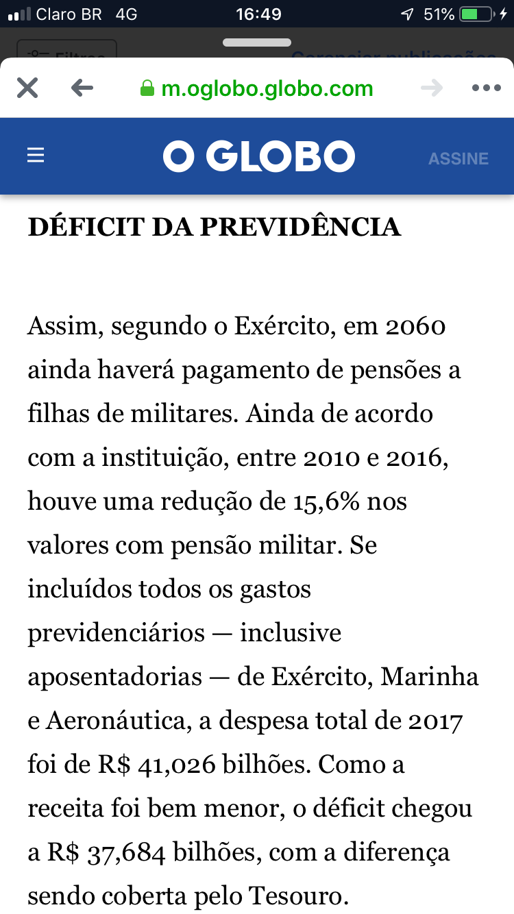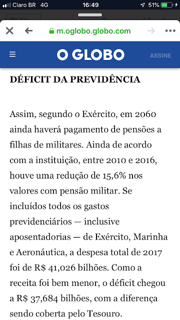 Assim, segundo o Exército, em 2060 ainda haverá pagamento de pensões a filhas de militares. Ainda de acordo com a instituição, entre 2010 e 2016, houve uma redução de 15,6% nos valores com pensão militar. Se incluídos todos os gastos previdenciários — inclusive aposentadorias — de Exército, Marinha e Aeronáutica, a despesa total de 2017 foi de R$ 41,026 bilhões. Como a receita foi bem menor, o déficit chegou a R$ 37,684 bilhões, com a diferença sendo coberta pelo Tesouro. Proporcionalmente, é um rombo maior do que entre os servidores civis federais e muito acima do que o registrado entre os trabalhadores atendidos pelo INSS.