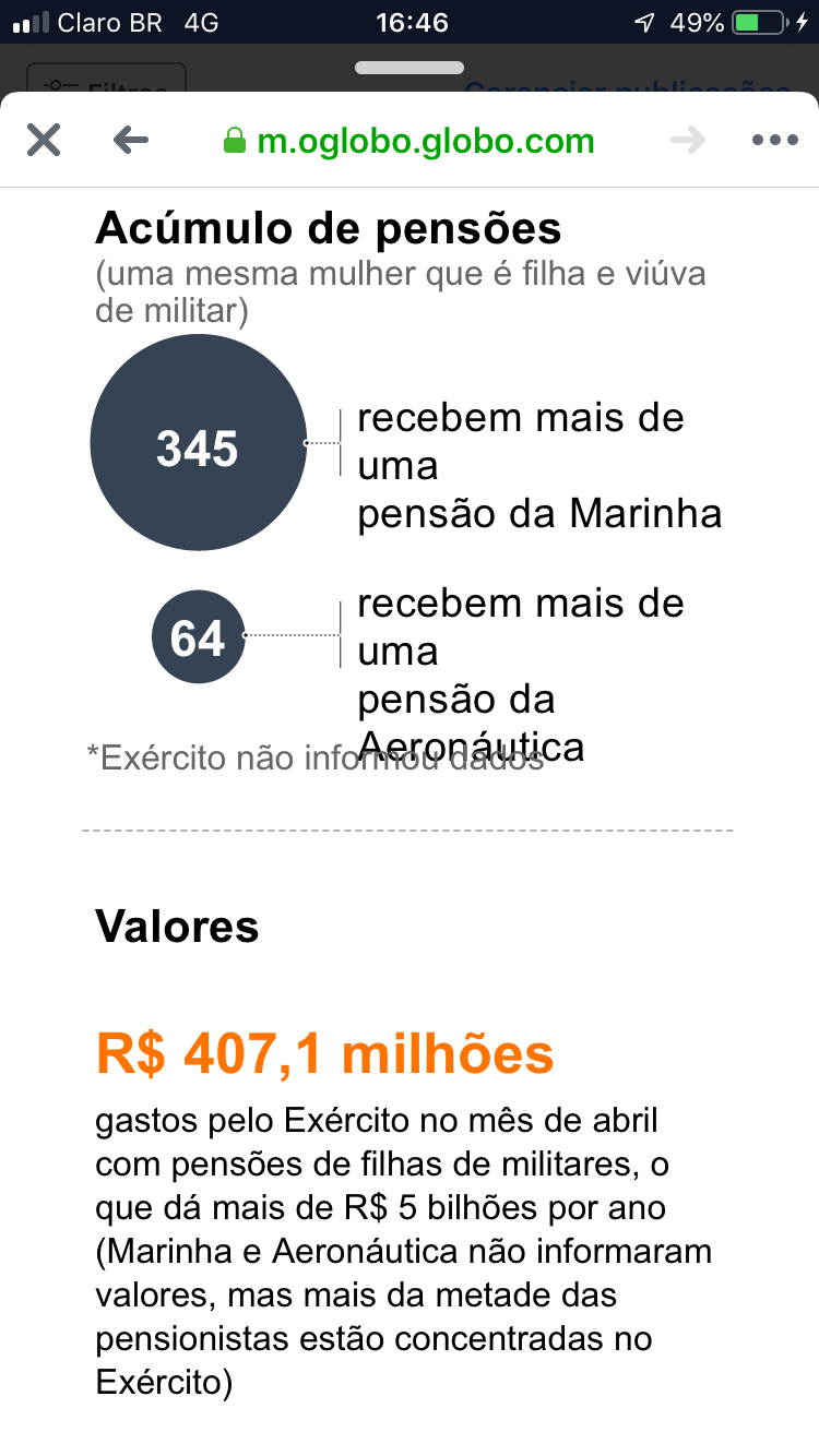 Exército e Marinha não informaram dado algum. Posteriormente, por meio da assessoria de imprensa, repassaram informações gerais. Segundo a Marinha, há 22.829 pensionistas filhas de militares, das quais 10.780 são casadas e 12.049 solteiras. Do total, 345 recebem mais de uma pensão. Mas, assim como a Aeronáutica, não divulgou valores. Já o Exército afirmou ter gasto R$ 407,1 milhões em abril com pensões de 67.625 filhas de militares, o que dá mais de R$ 5 bilhões por ano. Todas as receitas previdenciárias das três forças ao longo de 2017 — destinadas ao pagamento desse e de outros benefícios — ficaram em R$ 3,342 bilhões.