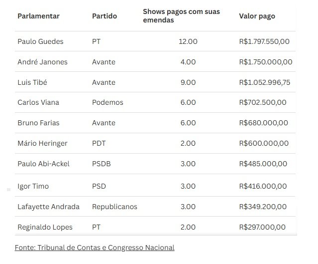 O deputado federal responsável pelo maior volume de emendas Pix para shows em Minas é Paulo Guedes (PT). Ele enviou aos municípios R$ 1,79 milhão desde 2023 para financiamento de eventos do tipo. Manga, no Norte de Minas, aparece na lista dos municípios beneficiados pelo parlamentar tanto em 2023 quanto em 2024. A cidade tem como prefeito o irmão do deputado, Anastácio Guedes (PT).