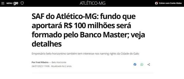 O “Globo Esporte”, site e telejornal esportivo da Rede Globo, deu a notícia, em 24 de julho de 2023, que Daniel Vorcaro – graças a uma operação coordenada pelo dono da CNN – passava a ser um dos donos do Atlético.