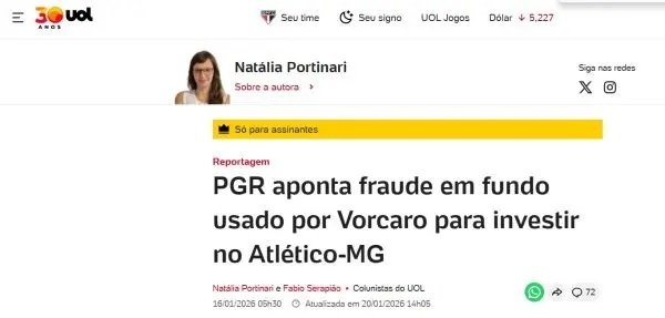 Mídia comercial noticiou investigação da PF sobre participação de Vorcaro no Atlético-MG, apenas não informou como ele foi parar lá (crédito: UOL)