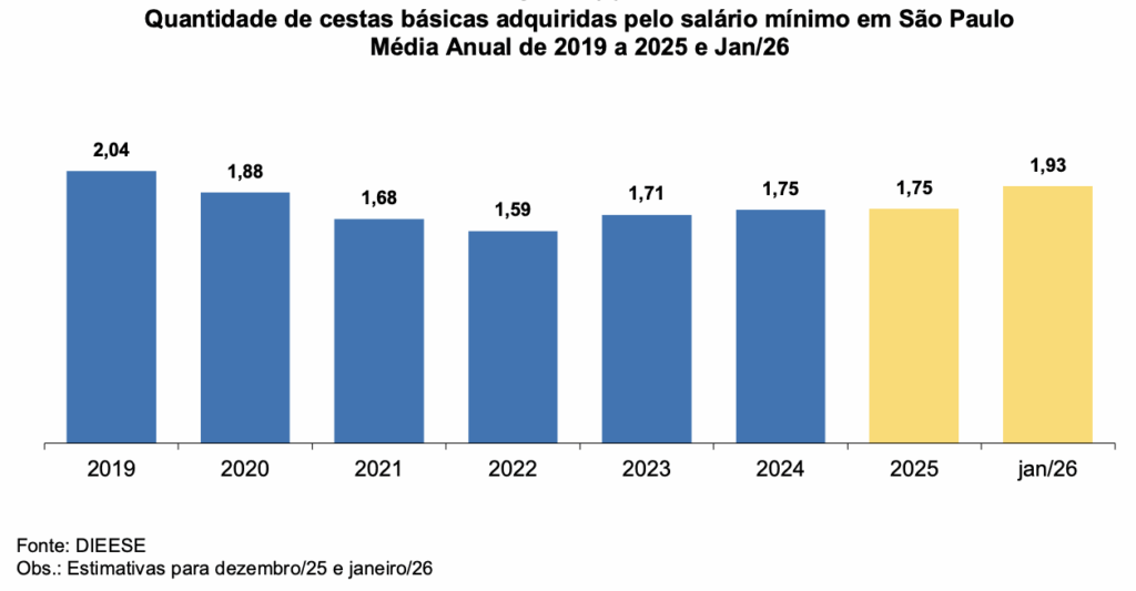 Em janeiro de 2026, o salário mínimo poderá adquirir 1,93 cestas básicas em São Paulo, o maior índice desde 2019. Ainda assim, o valor necessário para suprir necessidades básicas segue acima do piso oficial.