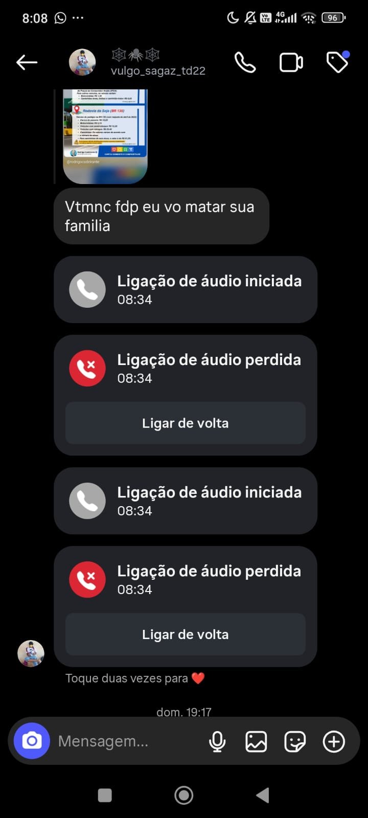 Motivação política, a propósito, é uma das linhas de investigação. Além de enviar mensagem, o agressor ainda tentou, sem sucesso, ligar várias vezes para a vítima, pelo Instagram. “Nós vamos te encontrar e você vai ter que explicar a razão das ameaças e quem te pagou”, avisou Cadeirante.